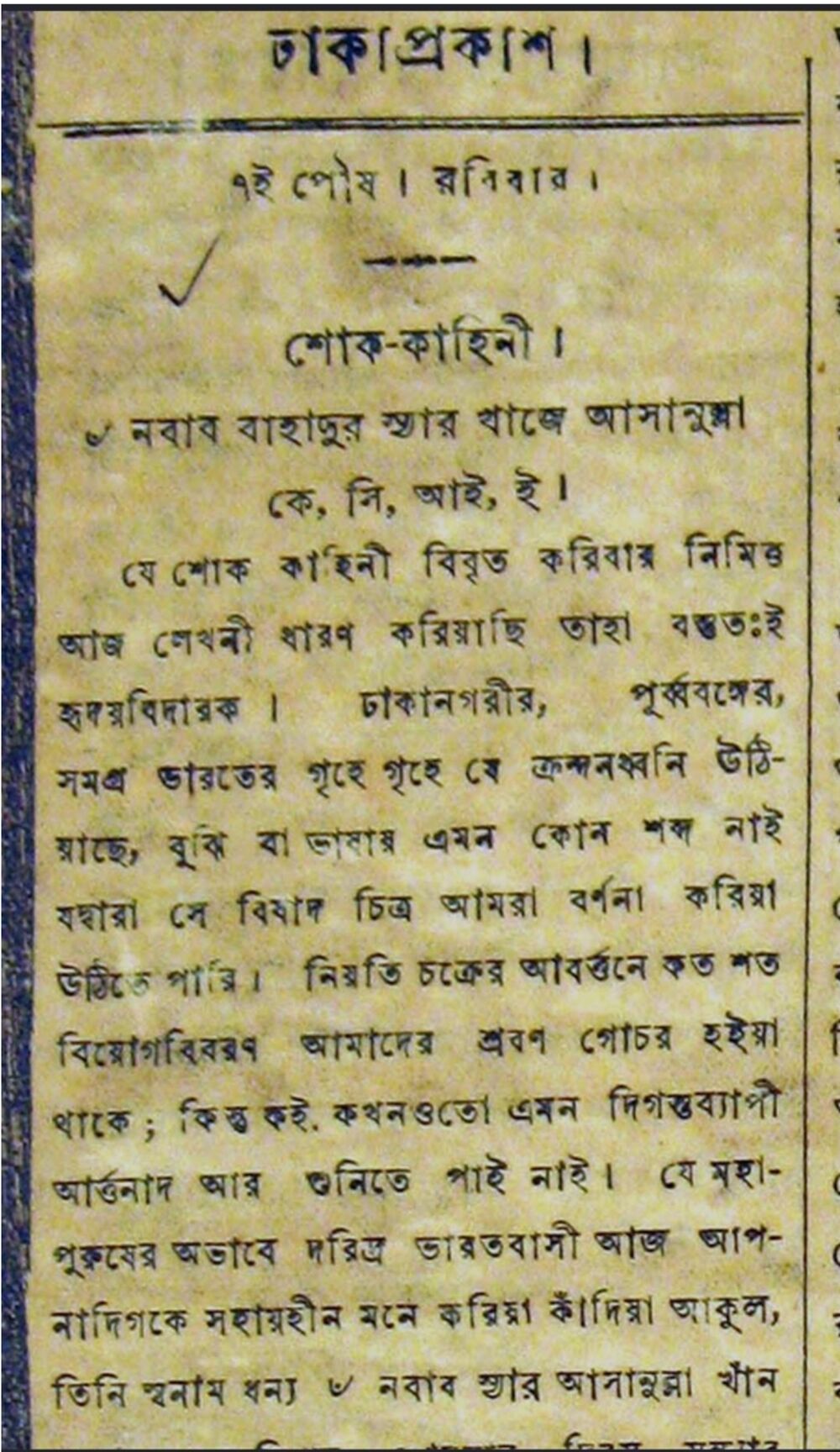 “ঢাকাবাসী দিগকে শোকসাগরে নিমগ্ন করিয়া পূর্ববঙ্গের গৌরব, স্বদেশের সুহৃদ, দরিদ্রের জীবন, সর্বসাধারণের একমাত্র আশ্রয় নবাব বাহাদুরের অমরাত্মা অনন্ত ধামে আশ্রয় গ্রহণ করিয়াছে। ভাওলাধিপতির বিয়োগব্যথা ভুলিতে না ভুলিতেই অভাগিনী বঙ্গজননী তাঁহার সর্বশ্রেষ্ঠ রত্নে বঞ্চিত হইবেন এ কথা স্বপ্নেও কেহ ভাবিতে পারে নাই। কিন্তু নিয়তির অলঙ্ঘ্য শাসন অতিক্রম করিবে কাহার সাধ্য। নবাব বাহাদুরের অপার অনুকম্পায় যে ঢাকাবাসী নিত্য সুখ সমৃদ্ধি লাভ করিয়া আসিতেছেন, রোগে, শোকে, আপদে, বিপদে যাঁহার সুমধুর আশ্বাসবাণী শ্রবণ করিয়া দীন দরিদ্র পূর্ববঙ্গবাসী জ্বালা যন্ত্রণা ভুলিতে সক্ষম হইয়াছে, তাঁহার বিয়োগ বার্তা শ্রবণে পূর্ববঙ্গবাসী আজ আপনাদিগকে কিরূপ বিপন্ন মনে করিতেছে কেমন করিয়া তাহা বর্ণনা করিব। কোথায় আজ আমাদের সেই দেবোপম নবাব বাহাদুর, স্বদেশের কল্যাণ সাধনকল্পে যাঁহার পবিত্র করকমল নিয়ত নিযুক্ত ছিল। কোথায় সেই দরিদ্রের জীবন, নিরন্নের অন্ন সংস্থান কল্পে যাঁহার ভান্ডারদ্বার নিয়ত উন্মুক্ত ছিল। কোথায় সেই বিপন্নের বন্ধু, হৃতসর্বস্ব সম্ভ্রান্ত ব্যক্তিবর্গ একমাত্র যাঁহার কৃপায় জীবন ধারণ করিতে সমর্থ হইত। বিধাতার বক্রদৃষ্টি বশে সকলেই আজ সাধের রত্নে বঞ্চিত হইয়া হাহাকার করিতেছে।