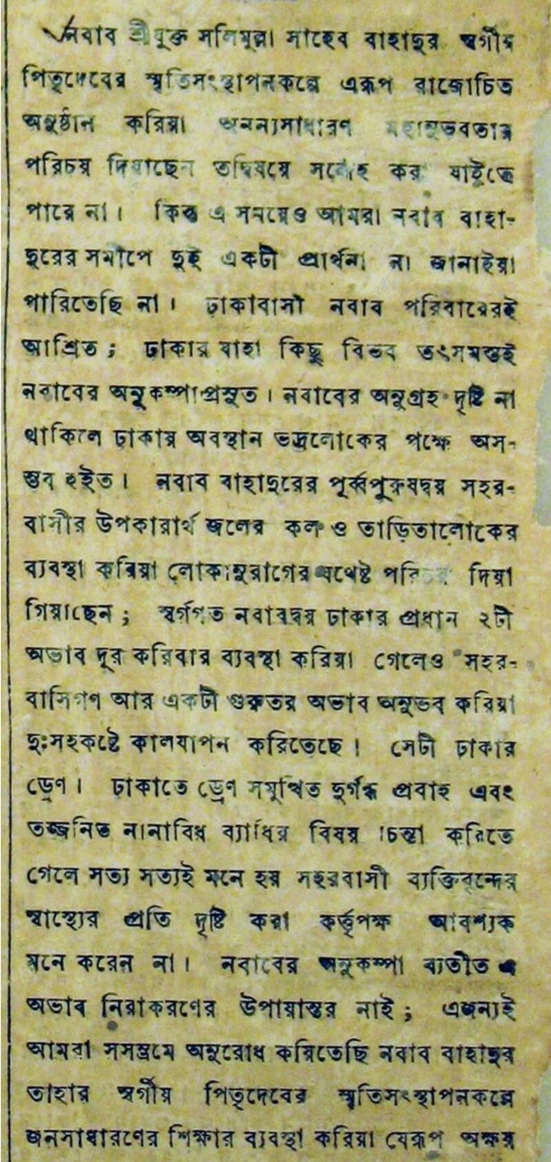 “নবাব শ্রীযুক্ত সলিমুল্লাহ সাহেব বাহাদুর স্বর্গীয় পিতৃদেবের স্মৃতিসংস্থাপনকল্পে এরূপ রাজোচিত অনুষ্ঠান করিয়া অনন্যসাধারণ মহানুভবতার পরিচয় দিয়াছেন তদ্বিষয়ে সন্দেহ করা যাইতে পারে না। কিন্তু এ সময়েও আমরা নবাব বাহাদুরের সমীপে দুই একটা প্রার্থনা না জানাইয়া পারিতেছি না। ঢাকাবাসী নবাব পরিবারেরই আশ্রিত; ঢাকার যাহা কিছু বিভব তৎসমস্তই নবাবের অনুকম্পা প্রস্তুত। নবাবের অনুগ্রহ দৃষ্টি না থাকিলে ঢাকায় অবস্থান ভদ্রলোকের পক্ষে অসম্ভব হইত। নবাব বাহাদুরের পূর্ব্বপুরুষদ্বয় সহর(শহর)- বাসীর উপকারার্থ জলের কল ও তাড়িতালোকের ব্যবস্থা করিয়া লোকানুরাগের যথেষ্ট পরিচয় দিয়া গিয়াছেন; স্বর্গগত নবাবদ্বয় ঢাকার প্রধান ২টা অভাব দূর করিবার ব্যবস্থা করিয়া গেলেও “সহর- বাসিগণ আর একটা গুরুতর অভাব অনুভব করিয়া দুঃসহকষ্টে কালযাপন করিতেছে। সেটা ঢাকার ড্রেণ। ঢাকাতে ড্রেণ সমুত্থিত দুর্গন্ধ প্রবাহ এবং তজ্জনিত নানাবিধ ব্যাধির বিষয় চিন্তা করিতে গেলে সত্য সত্যই মনে হয় সহরবাসী ব্যক্তিবৃন্দের স্বাস্থ্যের প্রতি দৃষ্টি করা কর্তৃপক্ষ আবশ্যক মনে করেন না। নবাবের অনুকম্পা ব্যতীত এ অভাব নিরাকরণের উপায়ান্তর নাই।”